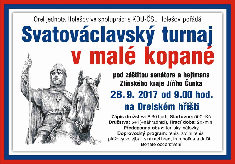 Orel jednota Holešov ve spolupráci s KDU-ČSL Holešov Vás zvou na tradiční Svatováclavský turnaj. Ve čtvrtek 28. září od 9.00 hodin budou družstva 5+1 zápolit o pohár v malé kopané.